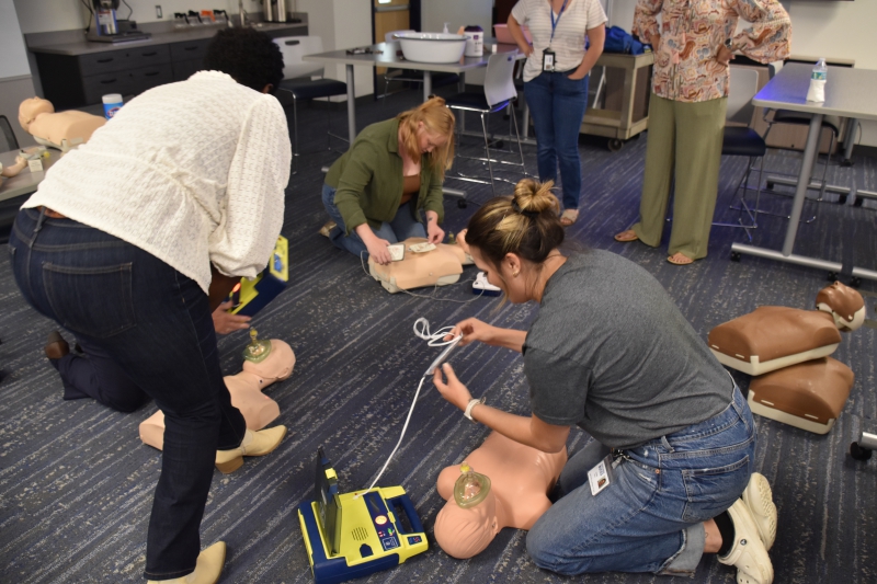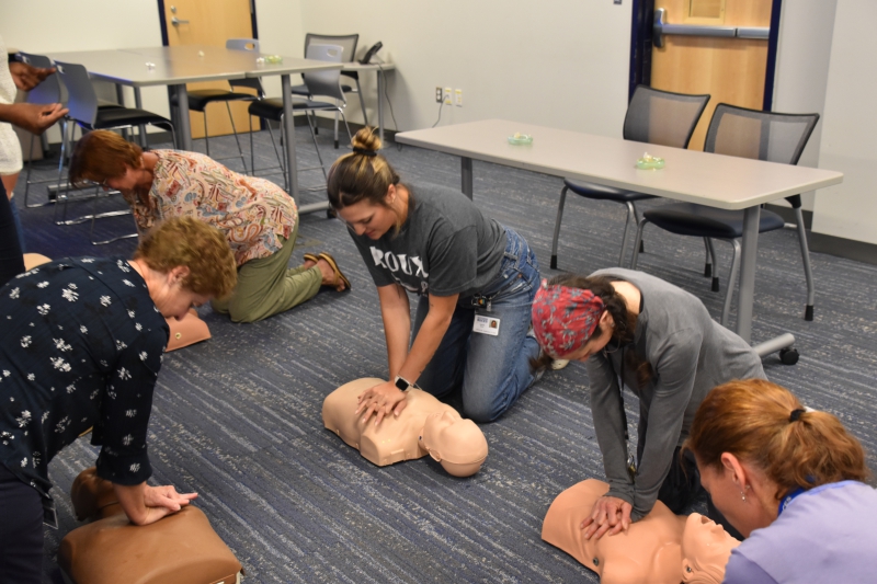 Coordinator of Health Occupations Joanne Williams held a Sept. 22 training showing participants how to perform CPR on adults, children and infants using dummies and how to use automated external defibrillators (AED). She noted that CPR massages the heart to stimulate it back to a regular rhythm and that doing something is better than nothing.